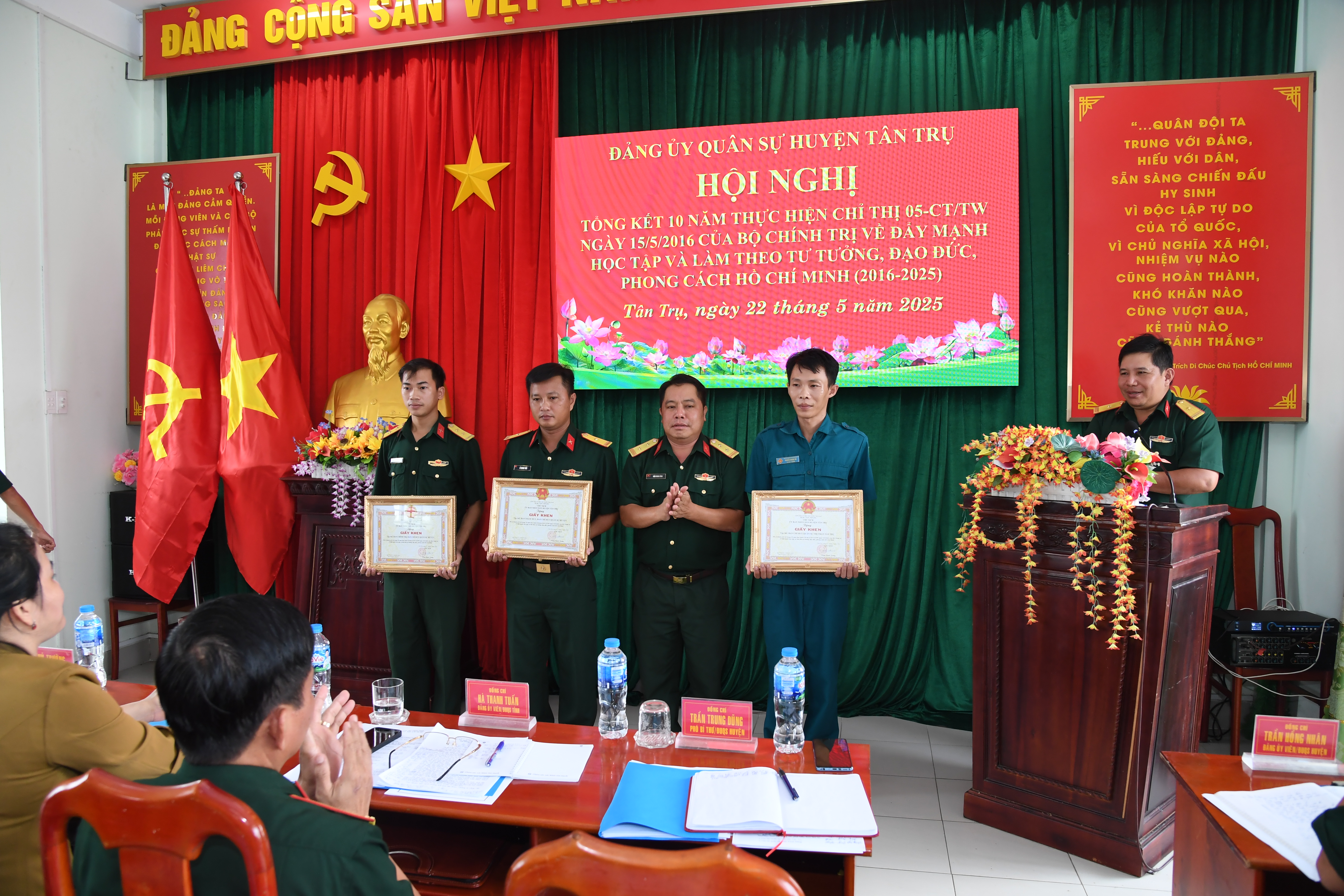 Tại hội nghị, Đảng ủy Quân sự huyện Tân Trụ đã biểu dương, khen thưởng 03 tập thể và 05 cá nhân tiêu biểu trong thực hiện Chỉ thị 05, ghi nhận sự nỗ lực, sáng tạo và lan tỏa trong thực tiễn công tác và cuộc sống.